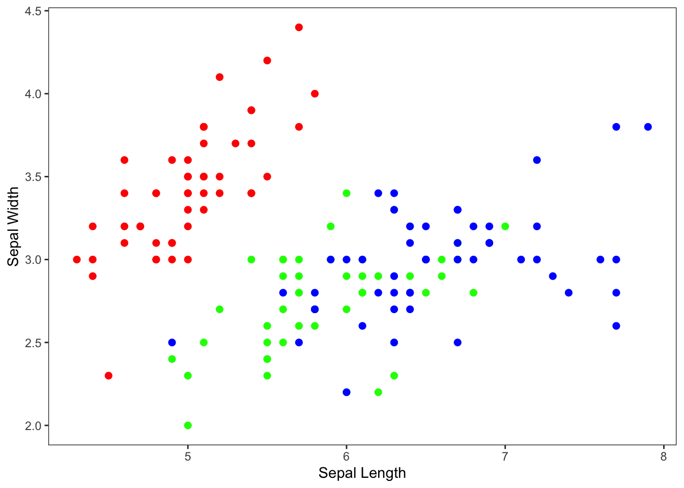 plot(Sepal.Width~Sepal.Length, data=iris, xlab="Sepal Length", ylab="Sepal Width", las=1, pch=19, col=pt.cols)