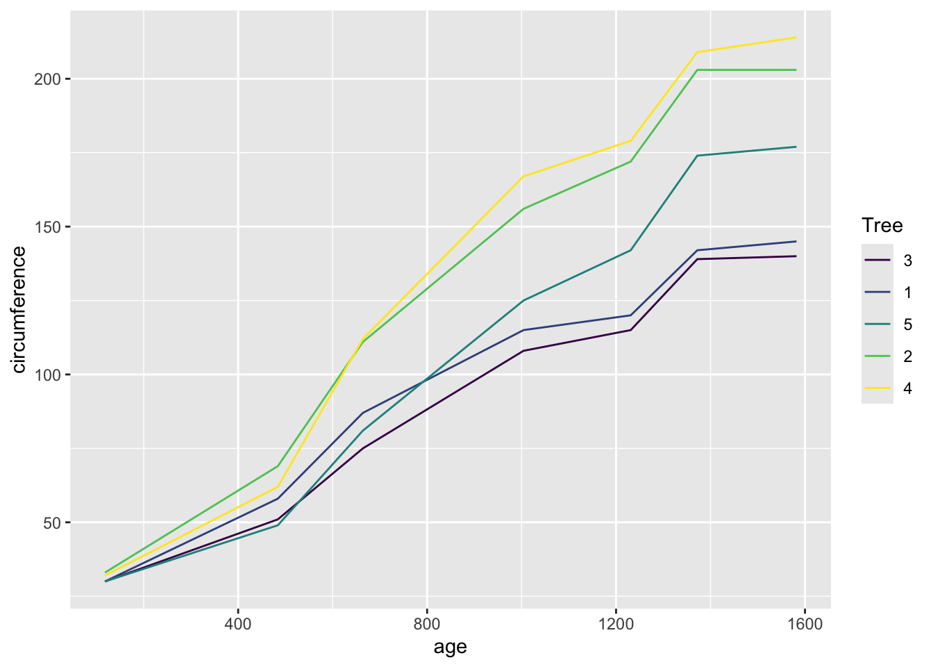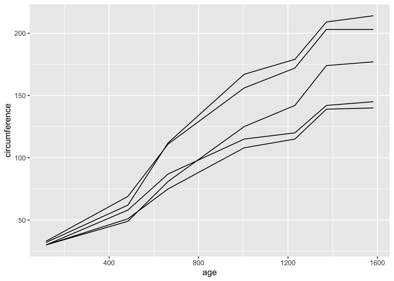 Here, “age” is a time variable. We can plot the change in the circumference of trees across age. However, there are data from multiple trees here, so we need to tell the function to plot each tree as a separate line. We can do this two ways.