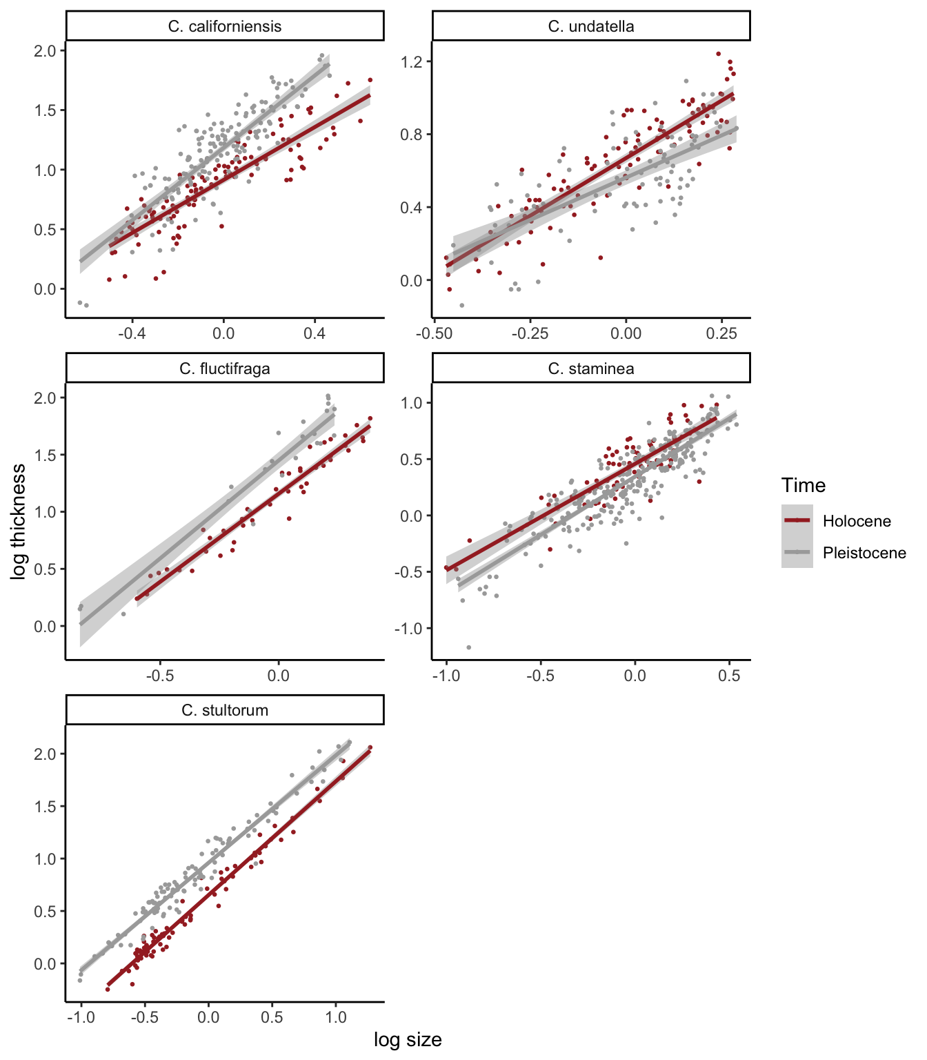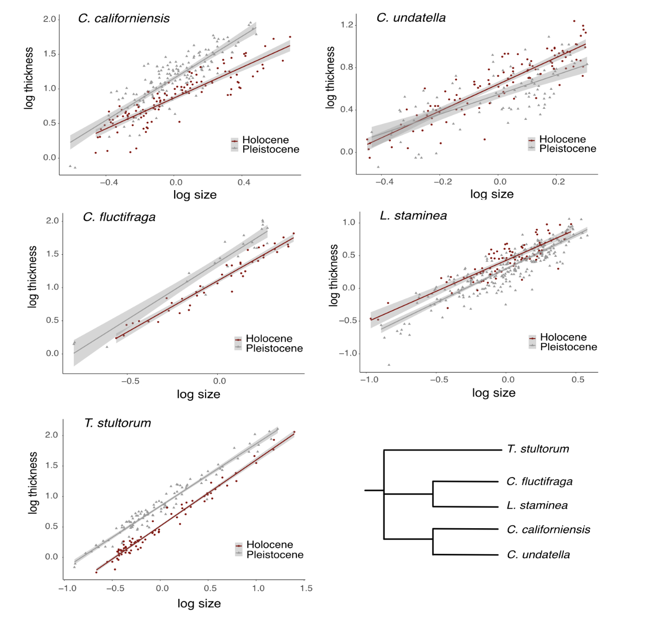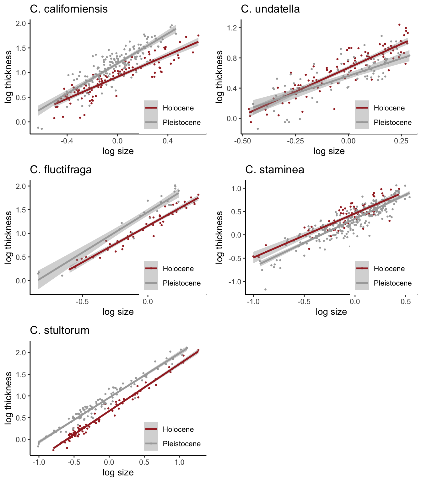 In this paper, the authors calculate allometric relationships between size and shell thickness for 5 species of bivalves across two different geologic time periods (Pleistocene and Holocene). They find that there are differences in these relationships across geologic time, and that the changes are species specific.