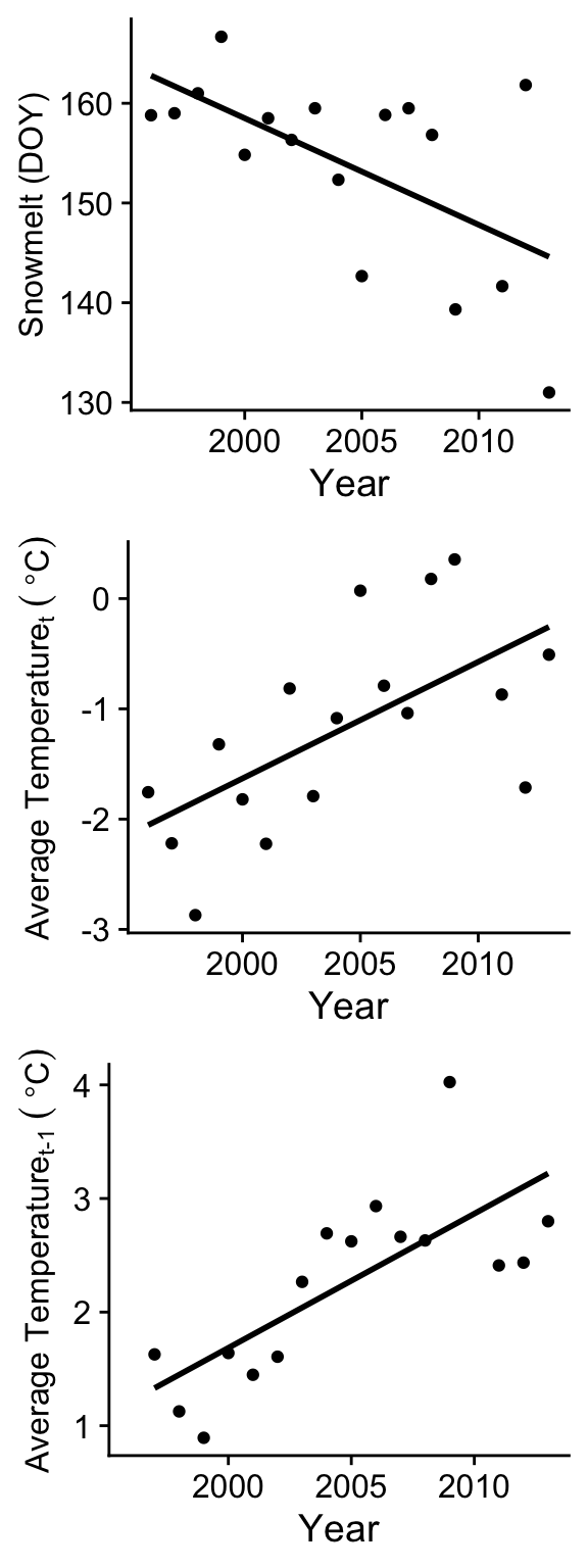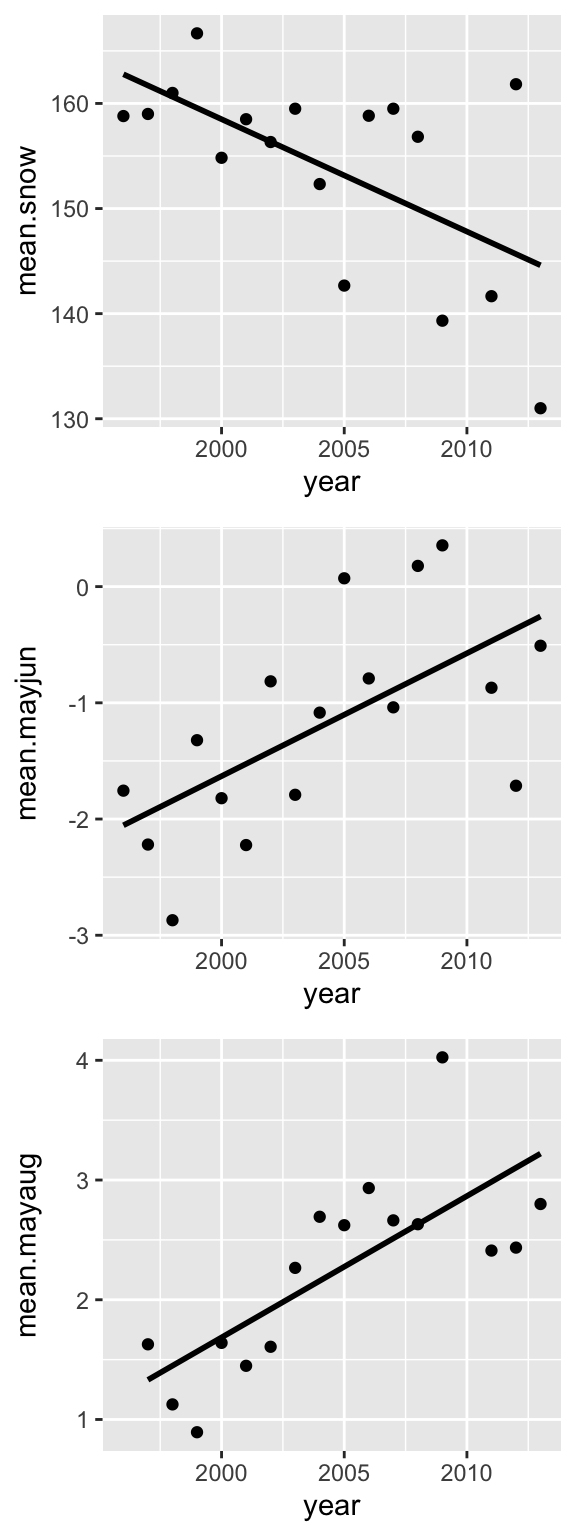 The first thing we will try is to re-create Figure 1, which has three panels and shows how the snowmelt dat, average May-June temperature, and average May-August temperature (of the previous year) has changed across the study period. They present this as a scatterplot and a simple linear regression fit line.
