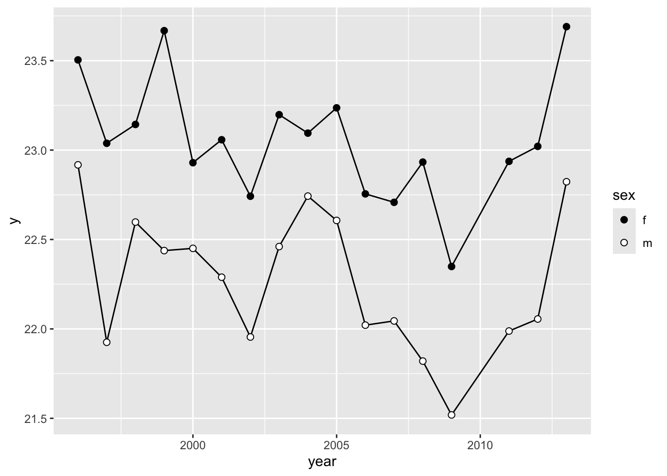 To go further, we can fix the details like skipping the year 2010 by plotting the points for years <2010 and years >2010 separately for each sex and each species, all in two vertical panels. I’ll also adjust the tick marks a bit: