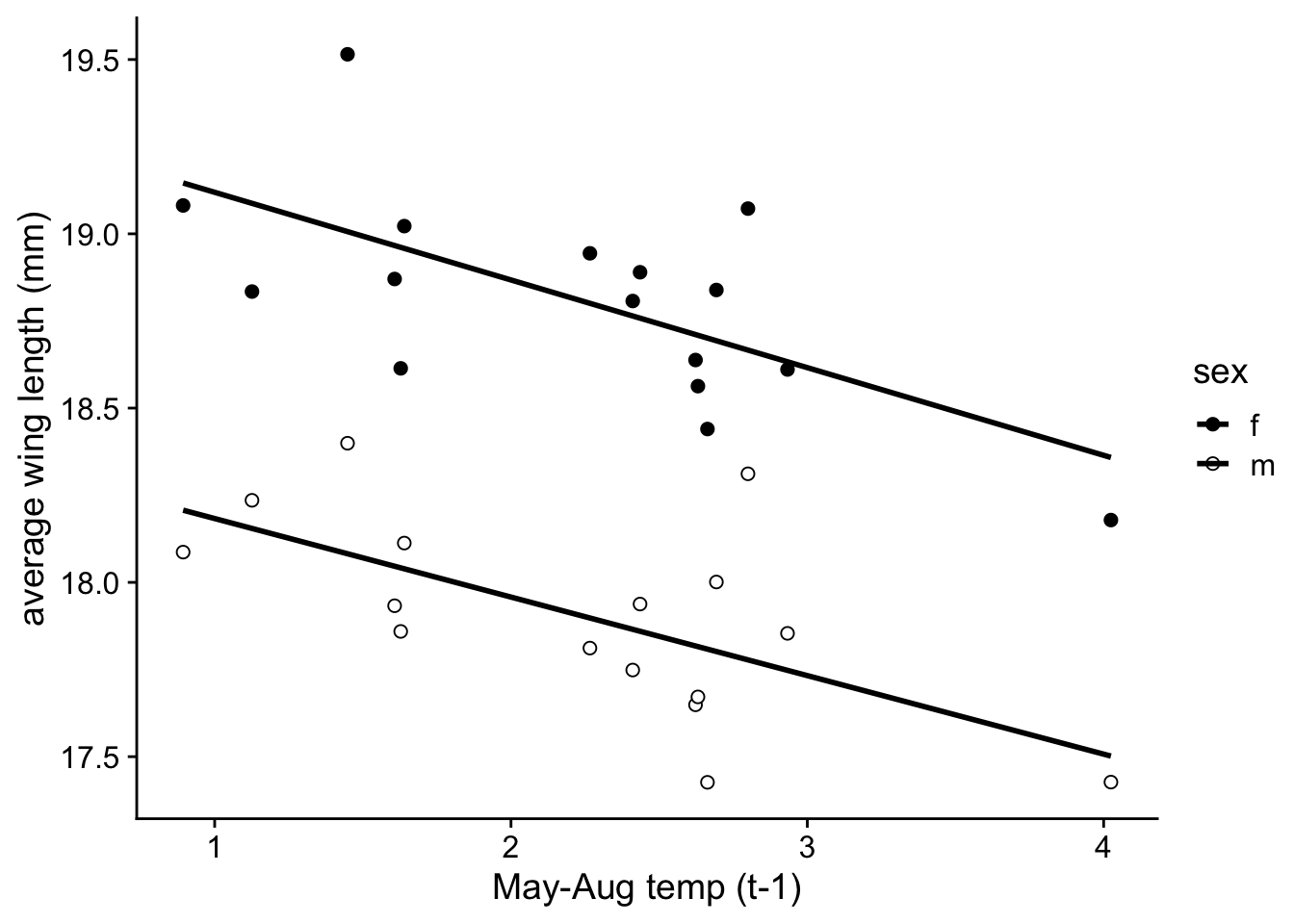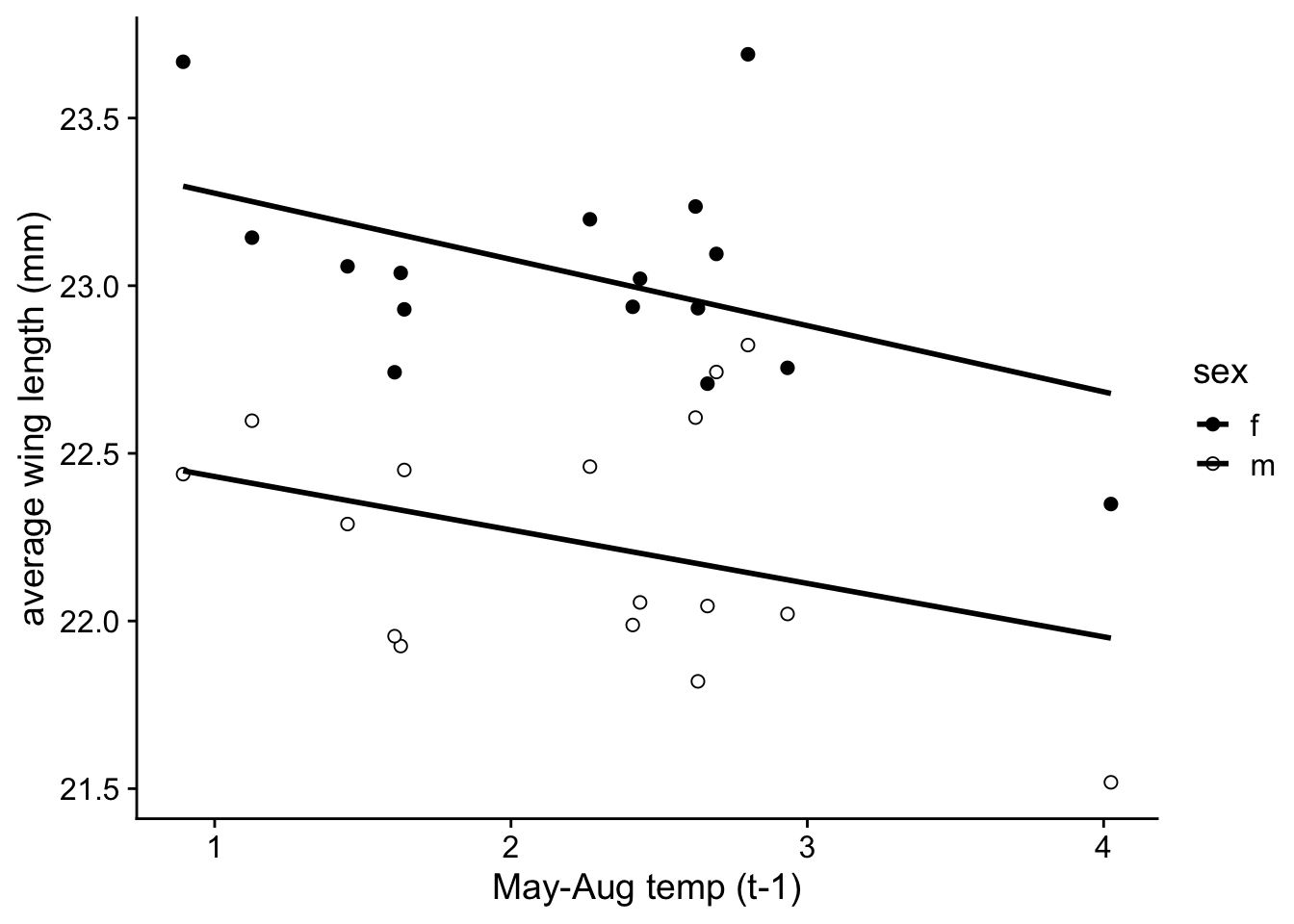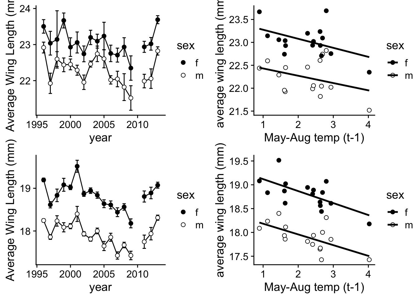 Now, we can make a scatterplot for each species’ winglength by the annual average temperature (May-August) where the average female wing lengths are filled black and males are filled white + add the linear regression line as we did with Figure 1.