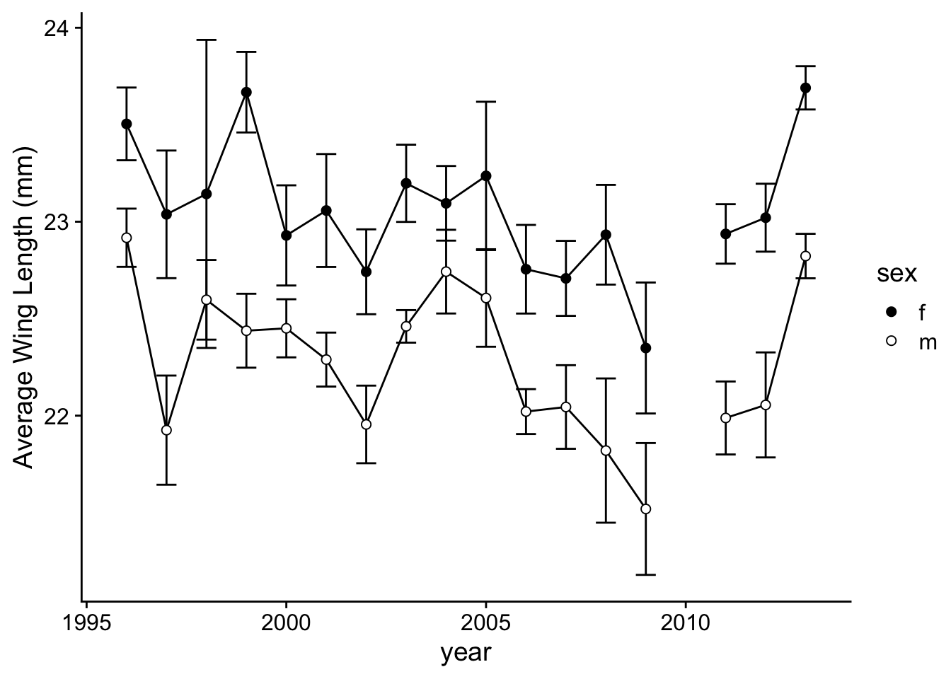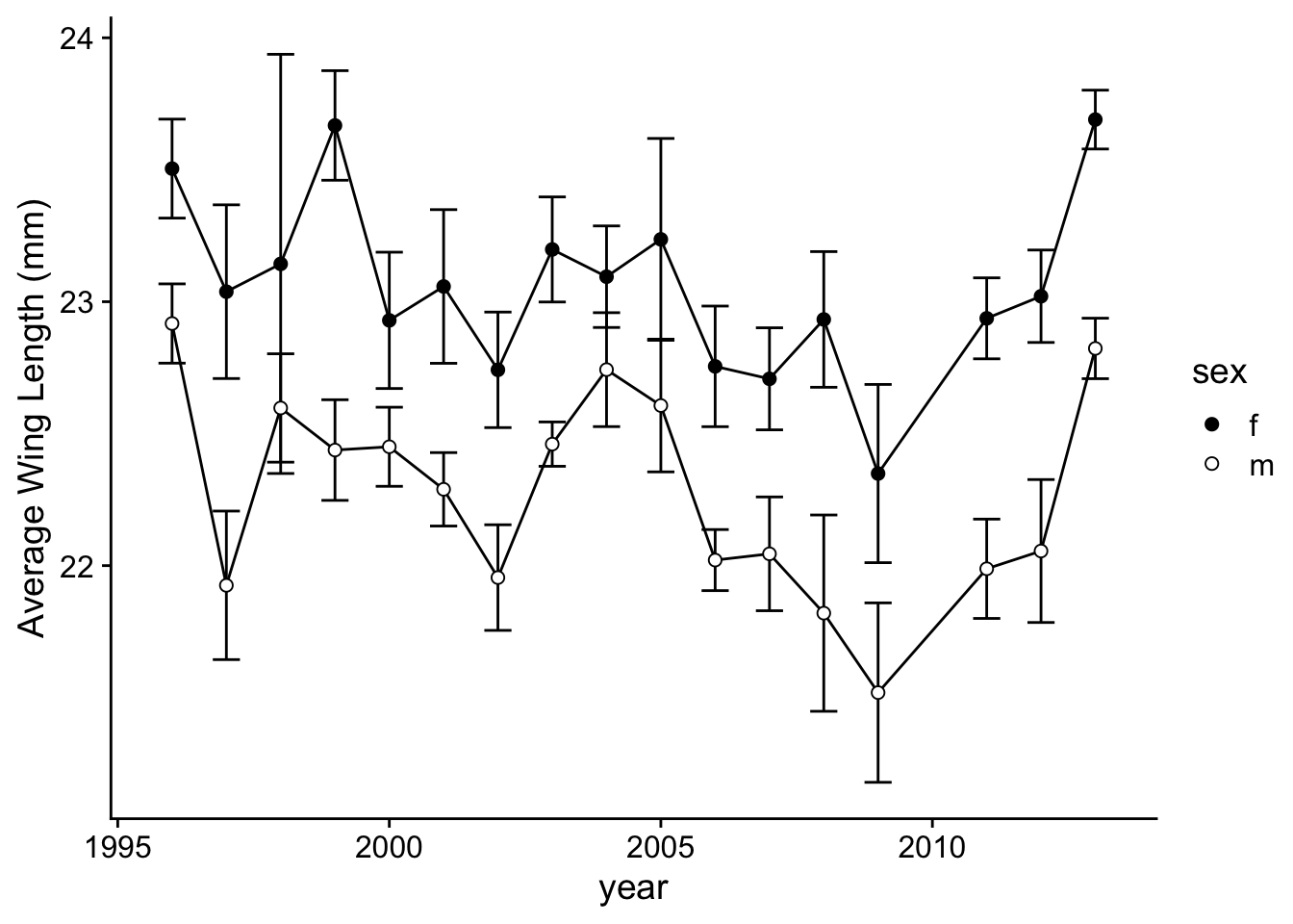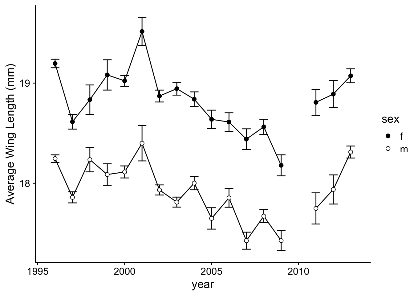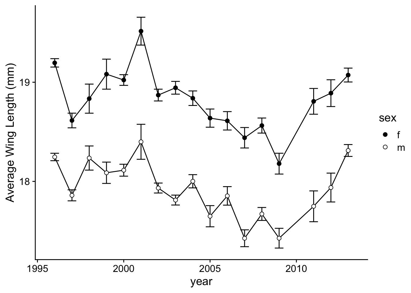 Now, we can make a scatterplot for each species’ winglength by the annual average temperature (May-August) where the average female wing lengths are filled black and males are filled white + add the linear regression line as we did with Figure 1.